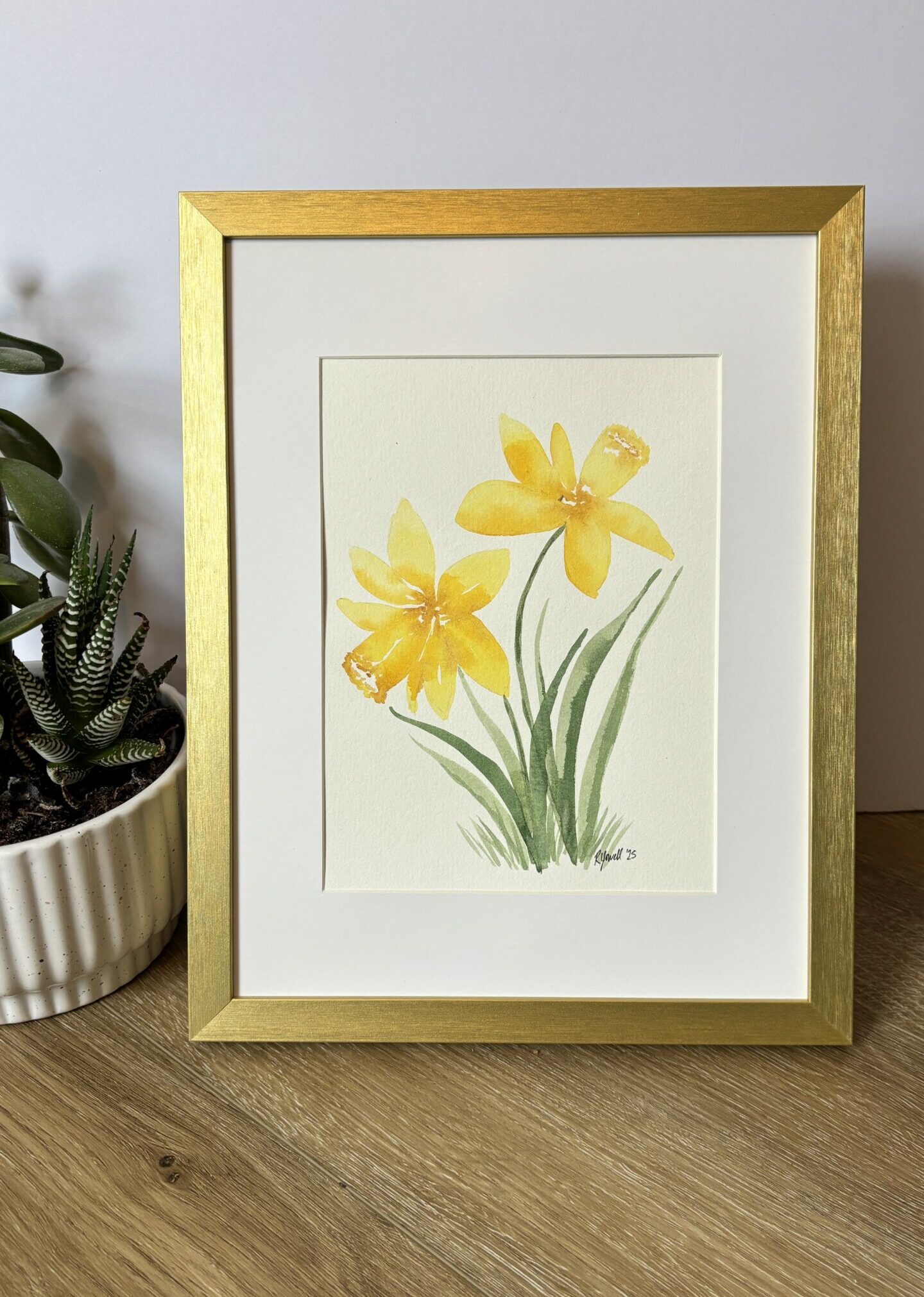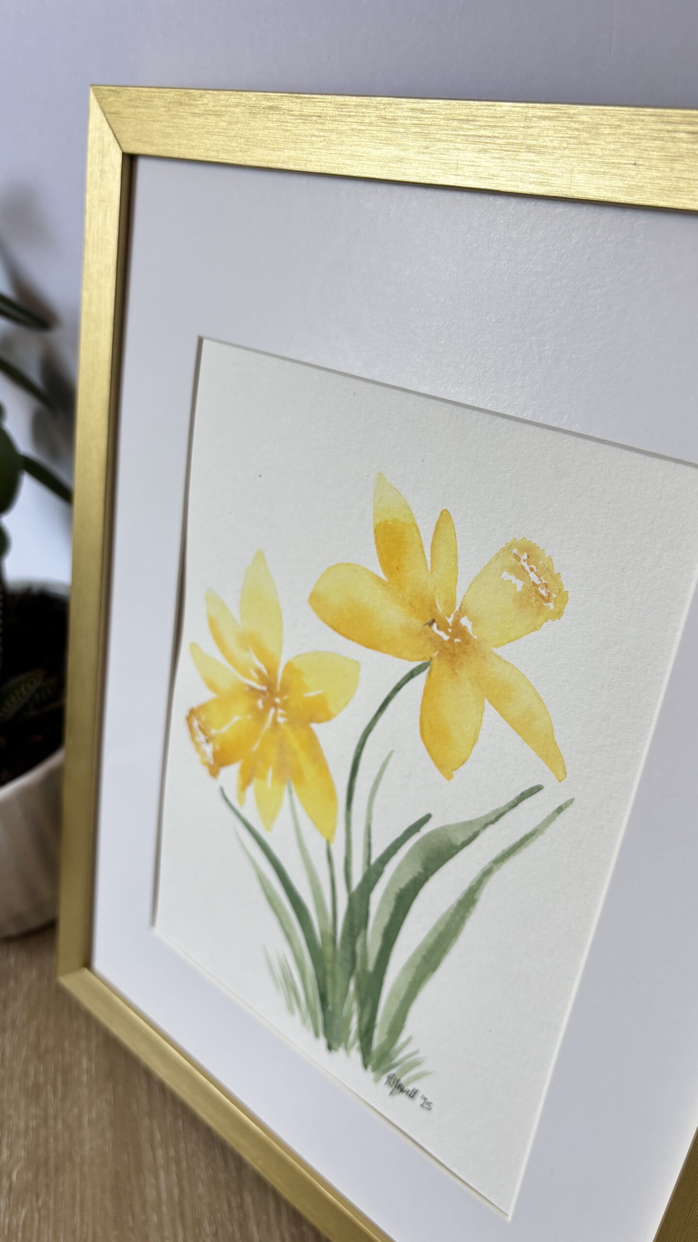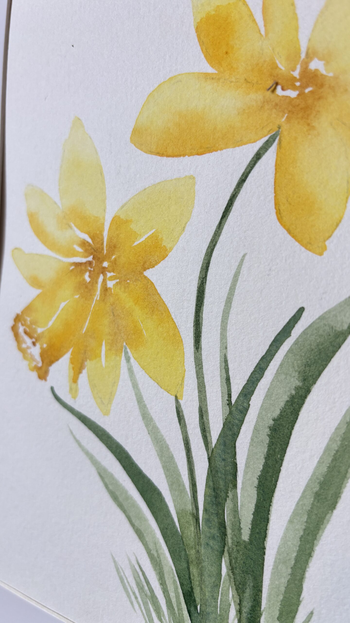 An original watercolor painting showcasing a spring’s finest blooms on the first day of spring- beautiful yellow daffodils!