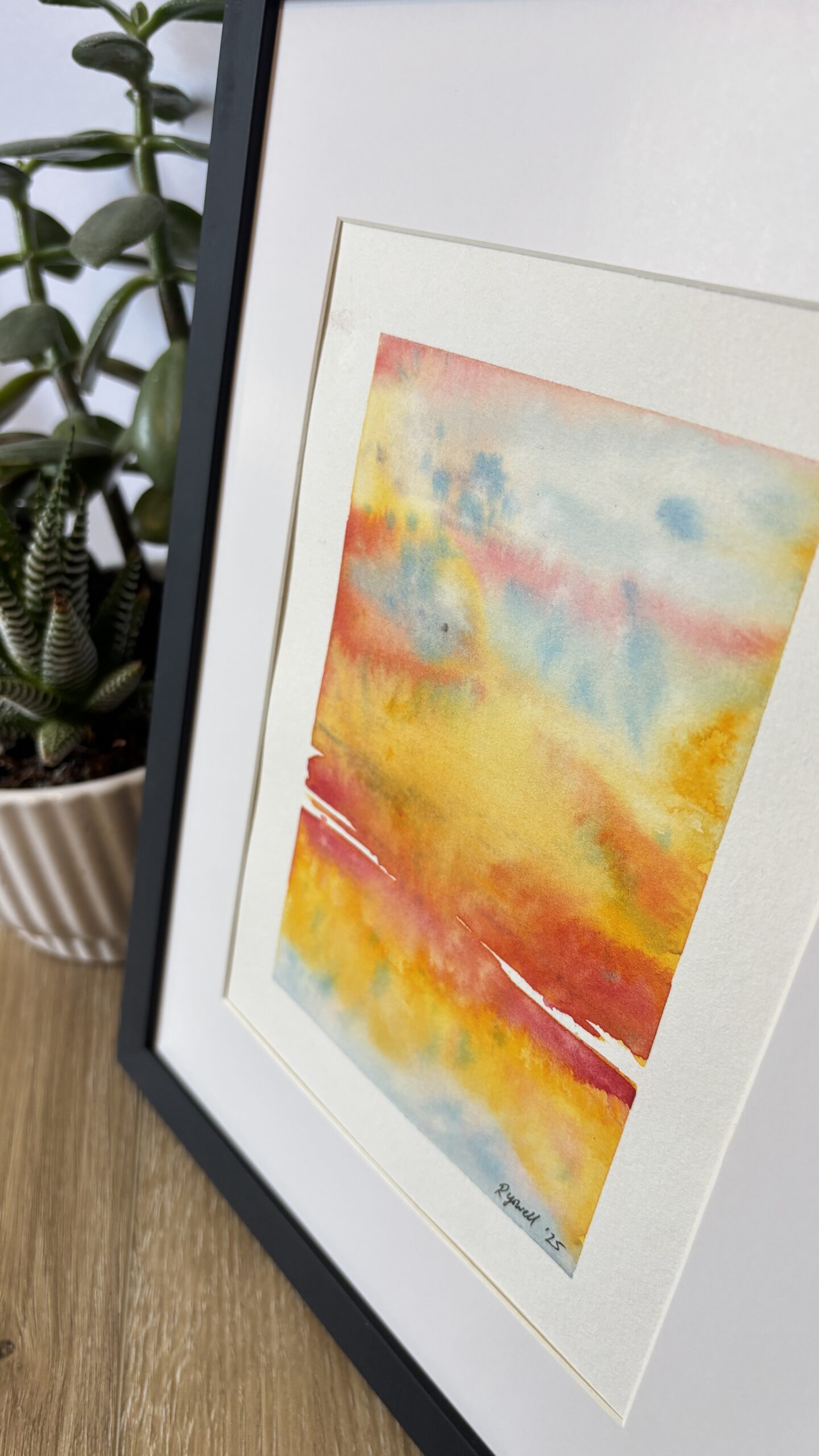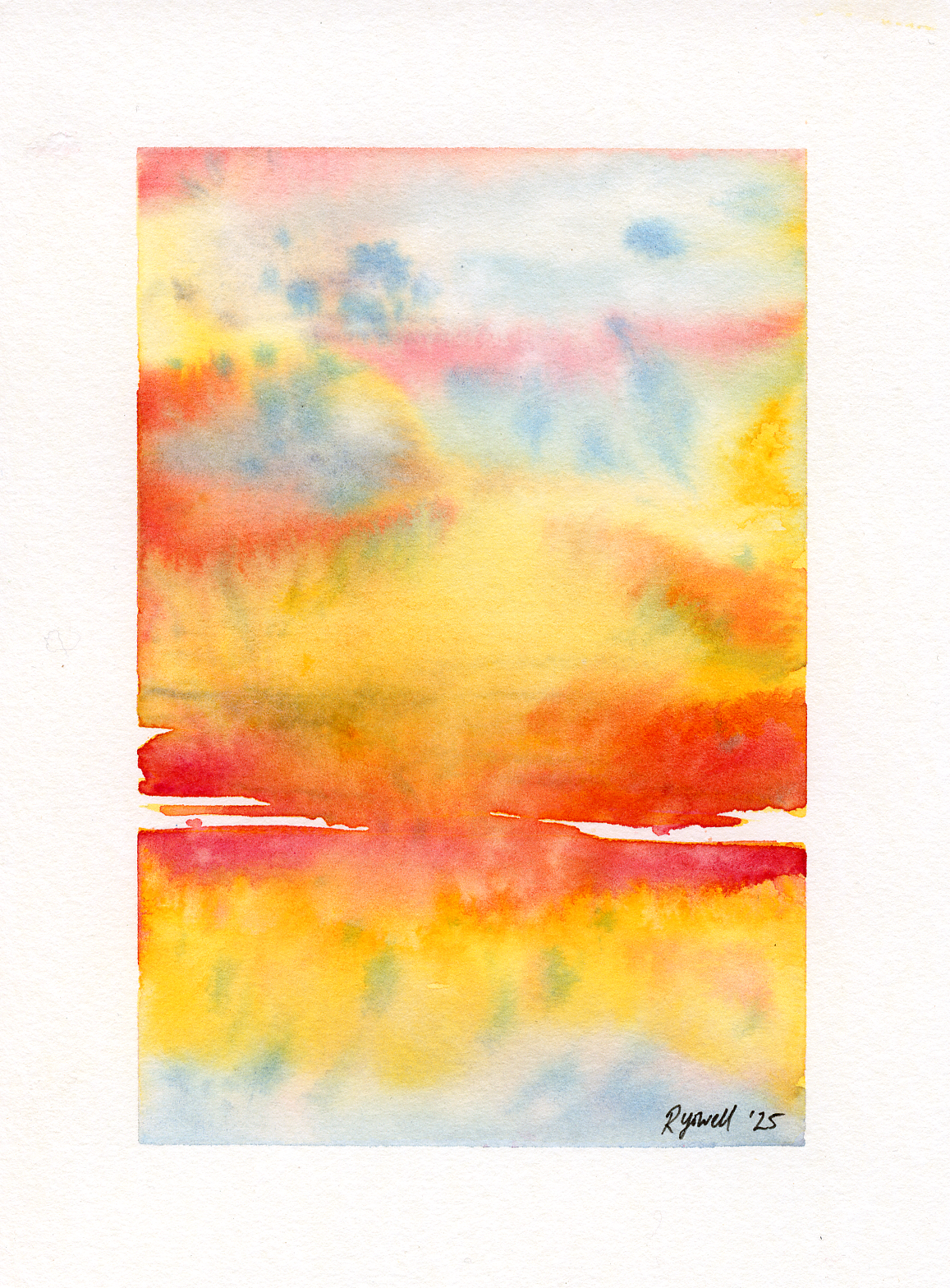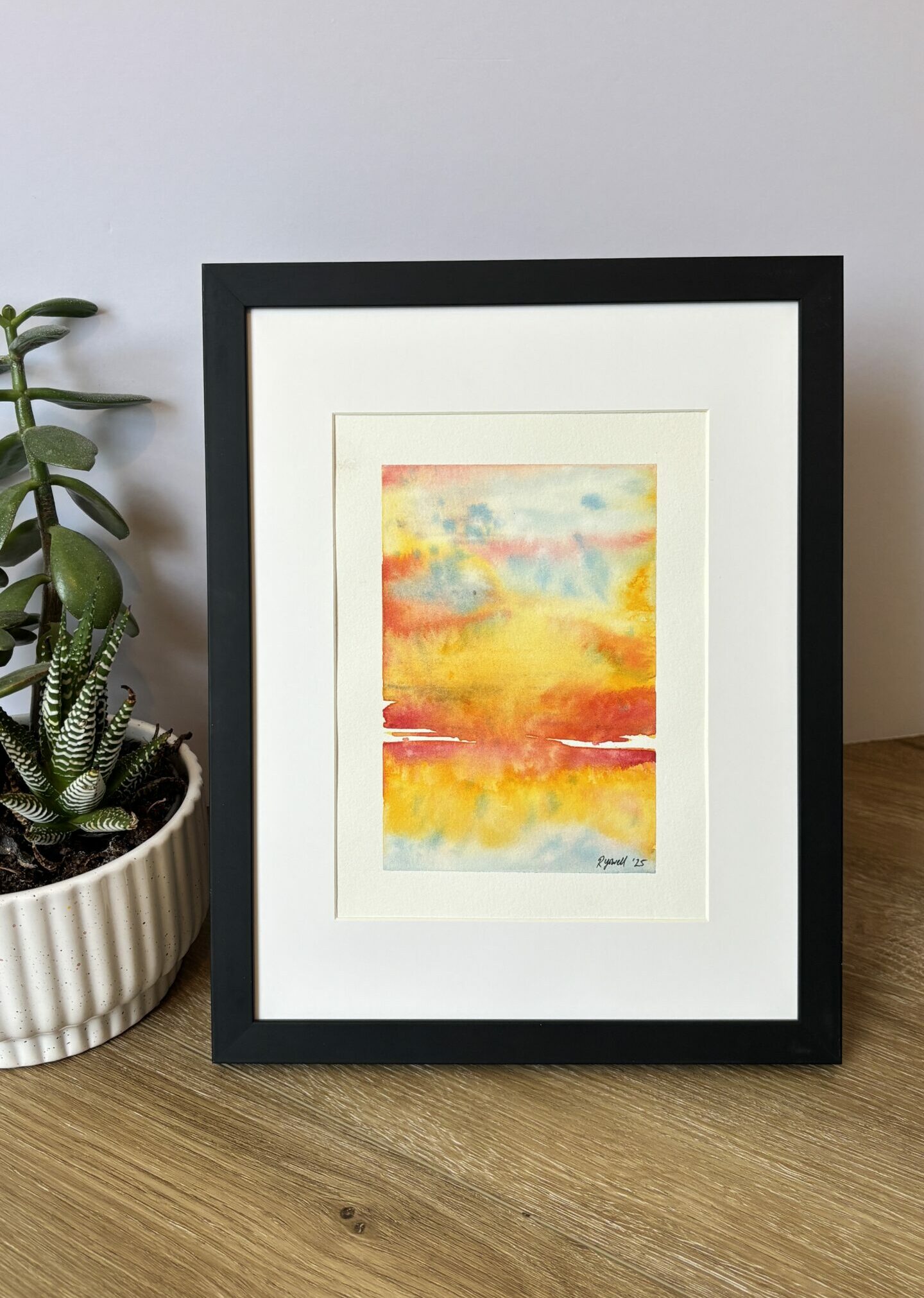 This captivating original abstract watercolor painting features a vibrant fusion of warm yellows, oranges, and pinks, blending into soft blues suggesting a radiant sunset over a distant horizon.