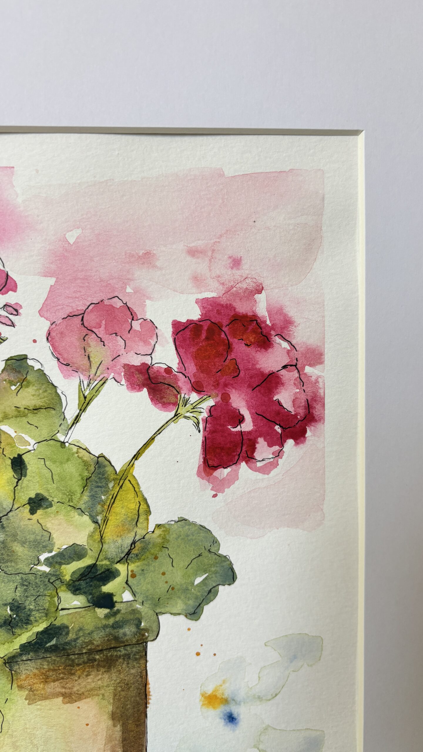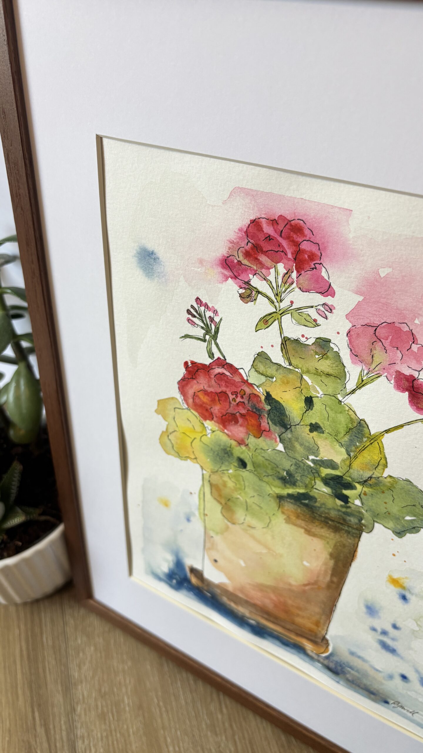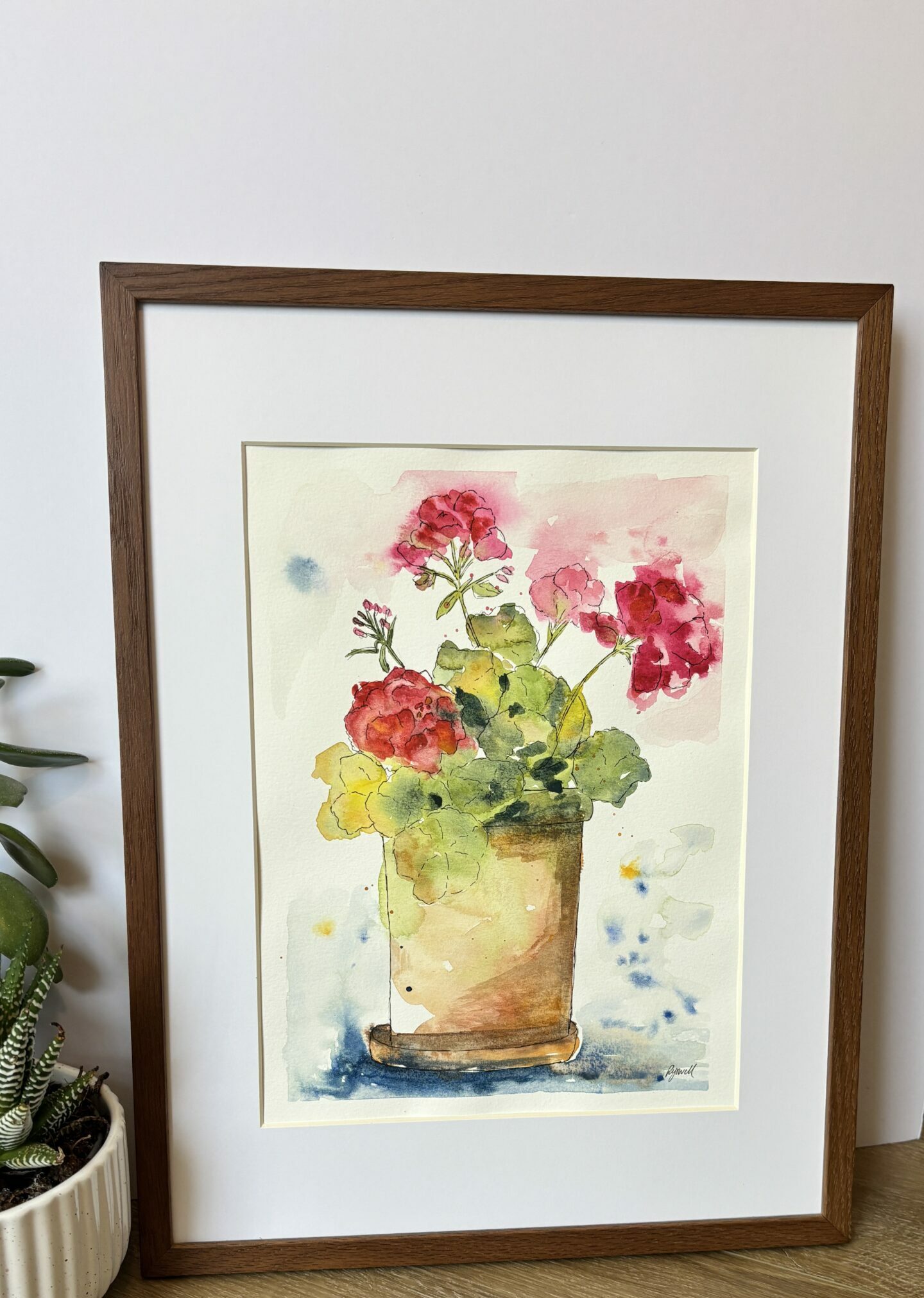 A vibrant original watercolor painting showcasing a charming geranium bouquet in a clay pot, with rich reds, soft pinks, and green foliage. It adds a touch of nature’s beauty to any space!